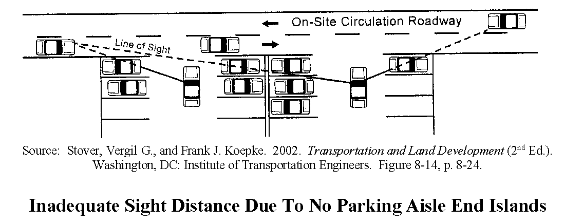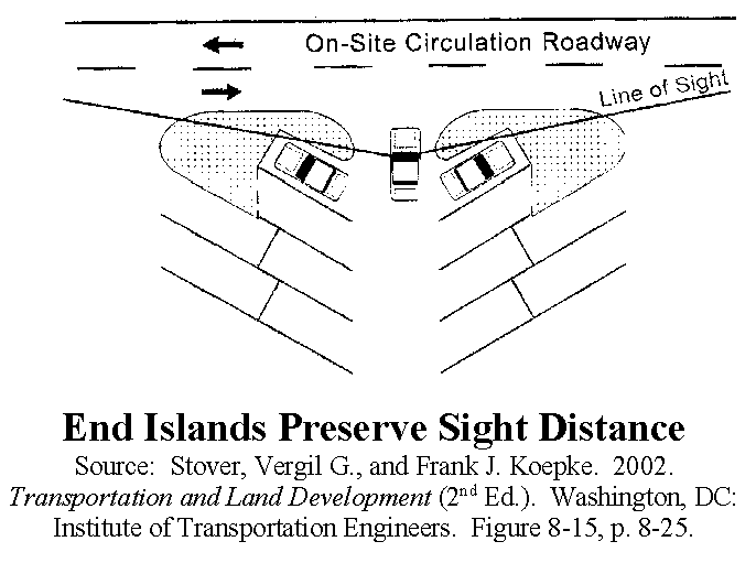 The intersection of parking aisles with a ring road or other on-site roadway or driveway shall provide adequate intersection sight distance. Parking aisle end islands shall be curbed unless that requirement is waived for water quality purposes or in a rural/exurban area; painted end islands are ineffective and are generally not permitted.