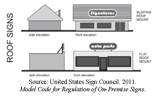 Findings. The object to which a sign is attached has important implications for compatibility with surroundings. Signs placed on building walls and in windows can be excessive if not regulated as to the area of the sign face, and it is in the public interest to ensure that building and window signs are proportional to the building wall or window on which the signs are placed. It is considered inappropriate to attach signs to certain objects like rocks and benches, thereby justifying certain prohibitions. It is also considered inappropriate to allow signs on roofs of buildings, justifying prohibition, since roof signs interrupt the silhouette of the building, overpower the architecture of the building, and can also block views.