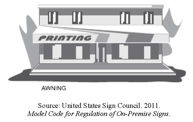 Awning sign: An awning that contains letters, numbers, symbols, pictures, logos, or visual display, or other communication, attached, painted on, or made an integral part of an awning. An awning is an architectural projection or shelter projecting from and supported by an exterior wall of a building and composed of a covering of rigid or non-rigid materials and/or fabric on a supporting framework that may be either permanent or retractable. Awning signs are "wall signs" for the purposes of this article.