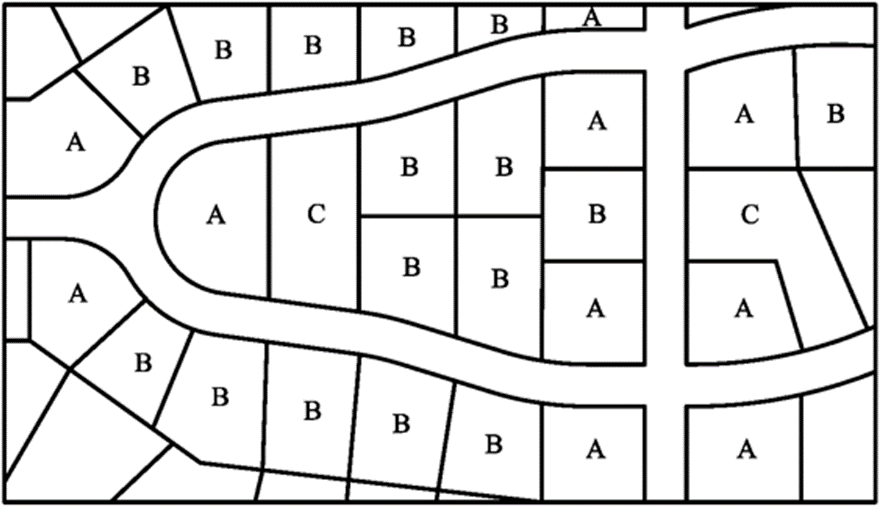 A = Corner lot, means a lot located at the intersection of two or more streets. A lot abutting on a curved street or streets shall be considered a corner lot if straight lines drawn from the foremost points of the side lot lines to the foremost point of the lot meet at an interior angle of less than 135 degrees. See lots marked "A" in the diagram.