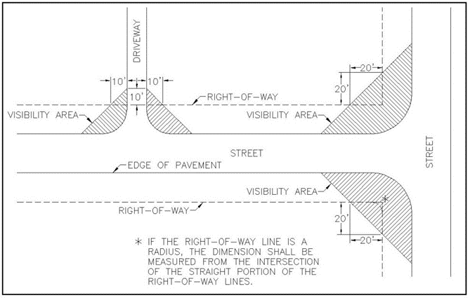 No fence, wall, sign, shrubbery, tree, planting, other structure or object capable of obstructing driver vision between the height of 2½ feet and 15 feet above the finished grade of adjacent streets shall be erected, permitted or maintained within 20 feet of the intersection of any public rights-of-way and within ten feet of the intersection of any driveways with public rights-of-way. Mailboxes, traffic control devices and appurtenances and those signs set forth in section 24-563(1) through (7) are excluded from this section. (See figure 3).