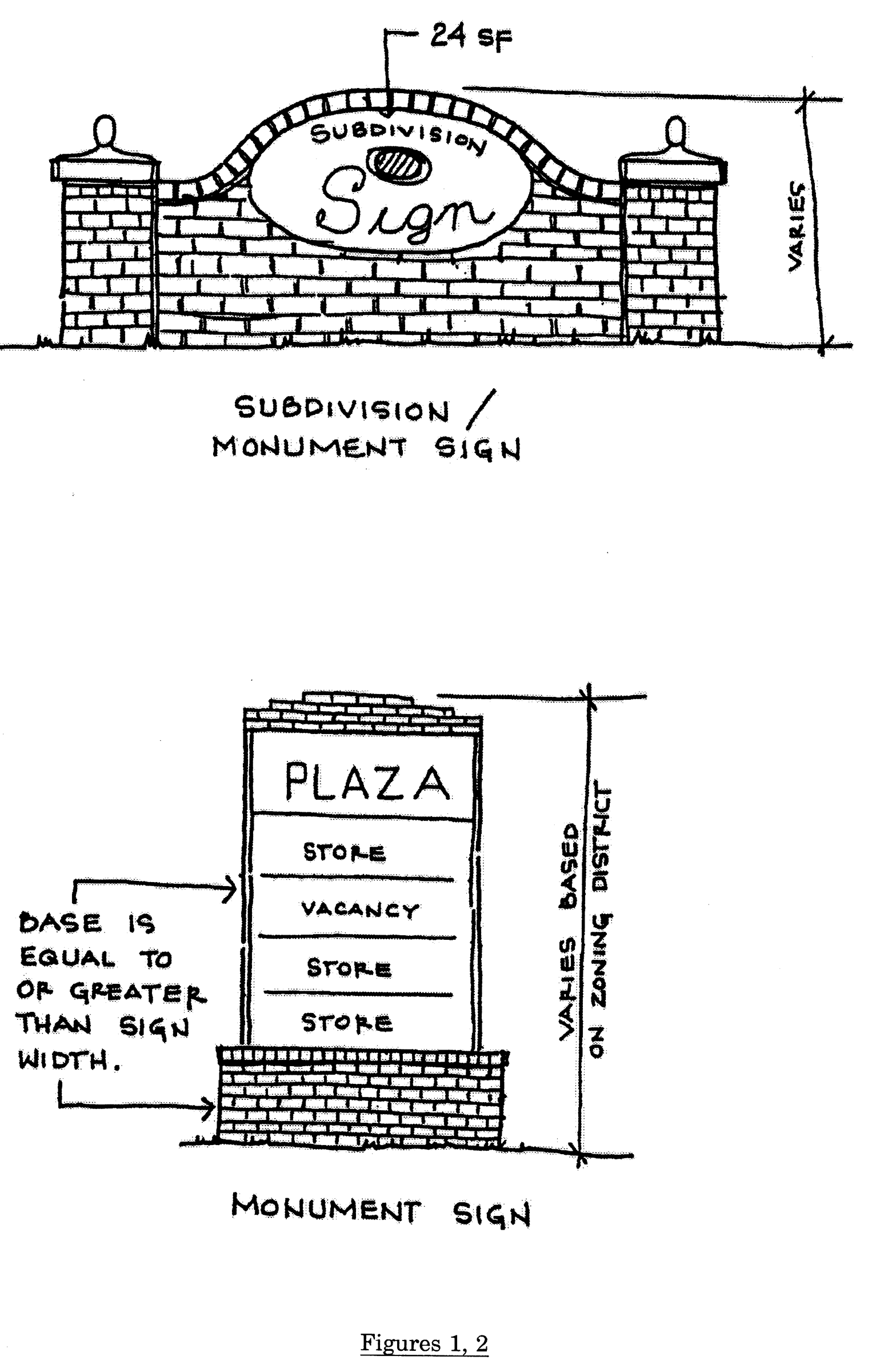 Monument sign: A freestanding sign mounted directly to the ground with a base which is at least two-thirds the horizontal length of the sign and with no visible space between the ground and the sign for the length of the base, except that there may be visible space not to exceed two feet in height between the base and the sign, provided that in no event shall the height of the visible space exceed the height of the base of the sign (Figures 1, 2 and 3, located at the end of this Section).