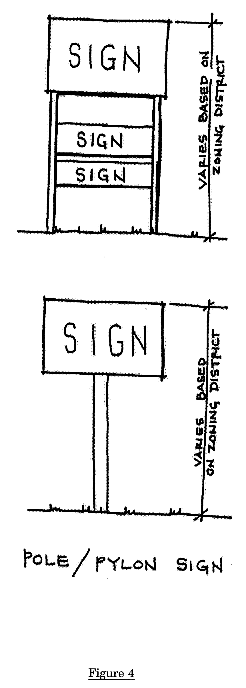 Pylon/pole sign: A freestanding sign, other than a monument sign, with a visible support structure, which support structure may or may not be enclosed with a cover (Figure 4, located at the end of this Section).