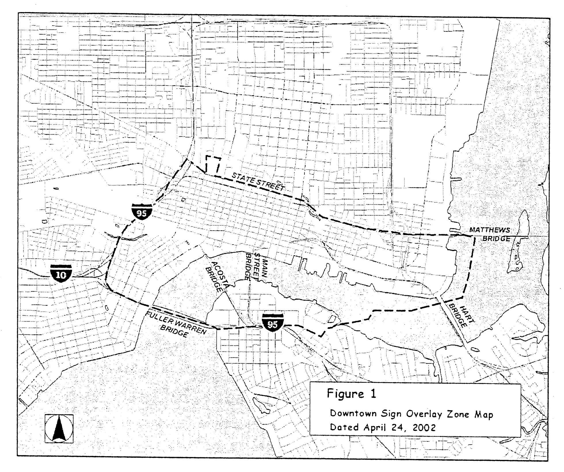 There is hereby created within the Downtown Sign Overlay Zone a Sports and Entertainment Complex Sign Overlay Zone, which shall consist of all land within the boundaries beginning at the intersection of the northerly right-of-way line of Gator Bowl Boulevard and the easterly right-of-way line of Georgia Street; thence run northerly along the easterly right-of-way line of Georgia Street to the northerly right-of-way line of Adams Street; thence run westerly along the northerly right-of-way line of Adams Street to the northerly right-of-way line of Monroe Street; thence run northerly and westerly along the northerly right-of-way line of Monroe Street to the easterly right-of-way line of Palmetto Street; thence run northerly along the easterly right-of-way line of Palmetto Street to the southerly right-of-way line of Duval Street, thence run easterly along the southerly right-of-way line of Duval Street to the easterly right-of-way line of Franklin Street; thence run northerly along the easterly right-of-way line of Franklin Street to the southerly right-of-way line of Beaver Street; thence easterly along the southerly right-of-way line of Beaver Street to the westerly right-of-way line of Haines Street; thence run southerly along the westerly right-of-way line of Haines Street to its intersection with Gator Bowl Boulevard; thence run southerly and westerly along the westerly and northerly right-of-way lines of Gator Bowl Boulevard to the point of beginning; together with the land south of Gator Bowl Boulevard comprising Metropolitan Park.