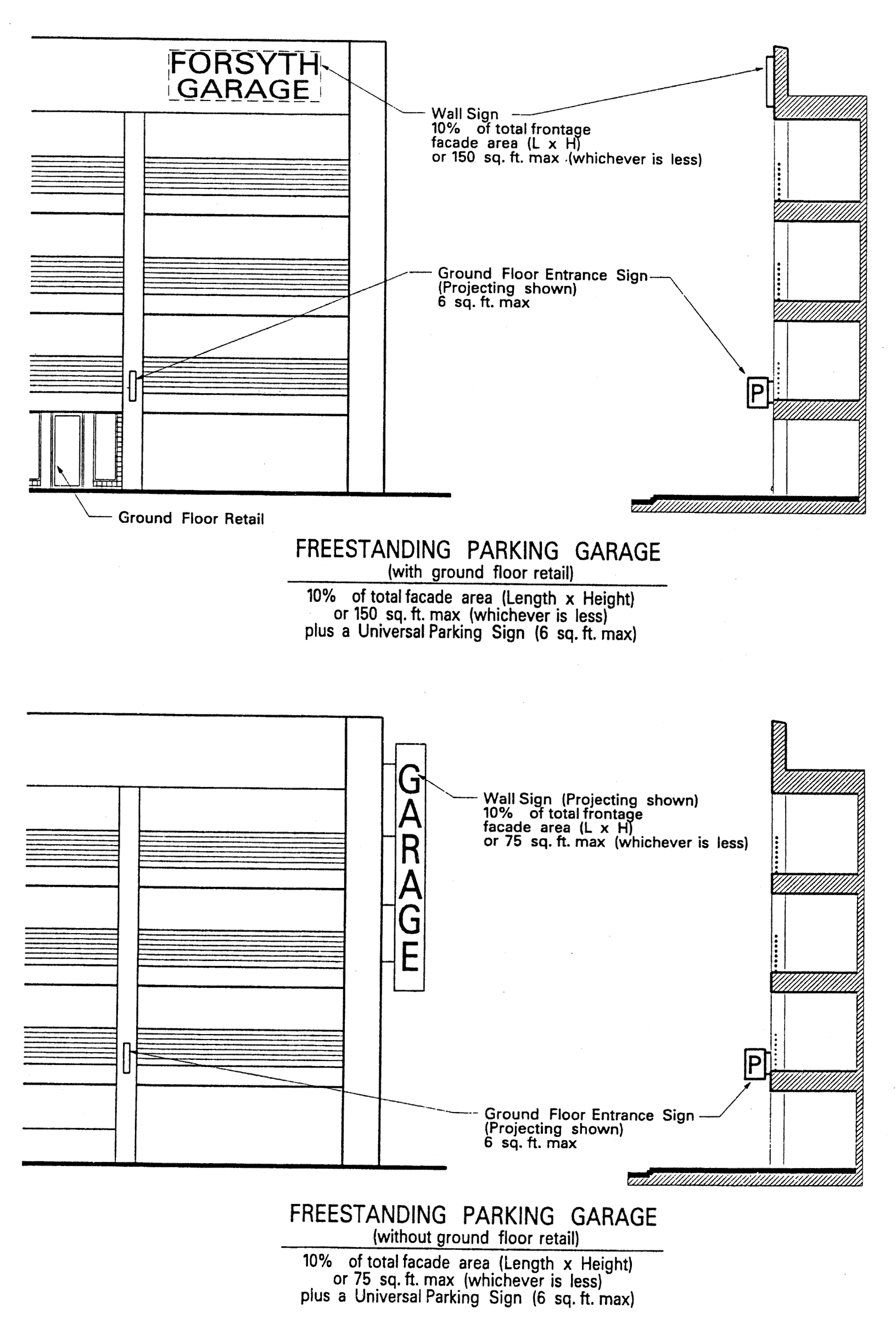 Parking garage signs: Parking garages are allowed wall signs, projecting signs or awning signs not exceeding a combined total of 75 square feet in area per side of street frontage. (See Figure 2). Provided, however, if the parking garage has ground floor retail sales or services, the maximum sign area shall not exceed 150 square feet per side of street frontage. In addition to other signs allowed pursuant to this subsection, there may be erected at each vehicle entrance to the parking garage one sign not exceeding six square feet containing only the universal symbol for parking (white "P" on blue background (See Figure 2)), and a directional arrow.