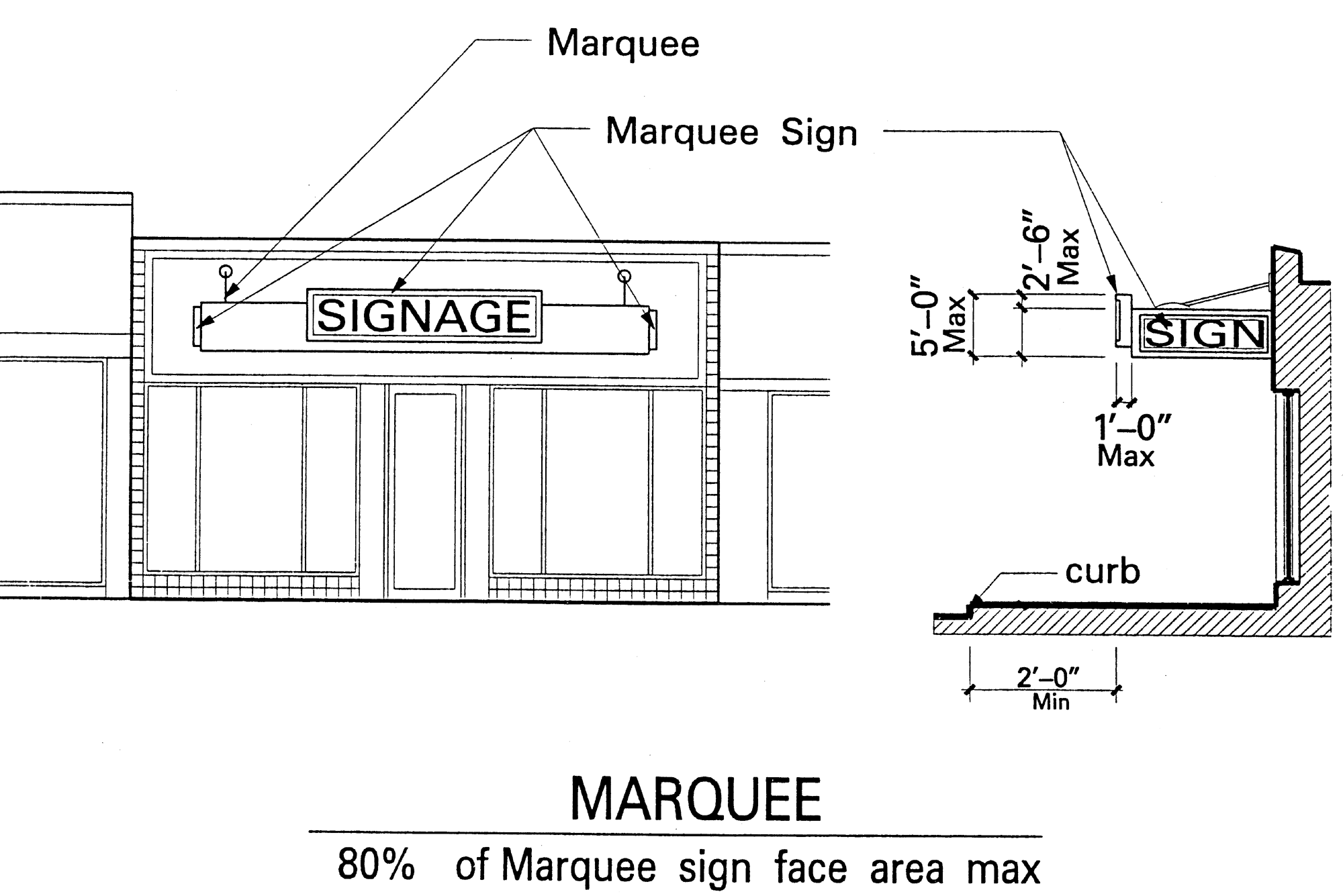 Marquee sign: A sign which is attached to, or hung from, a permanent rooflike structure which is supported by a building wall and which projects out from the building line usually, but not necessarily, over a public right-of-way such as a sidewalk.