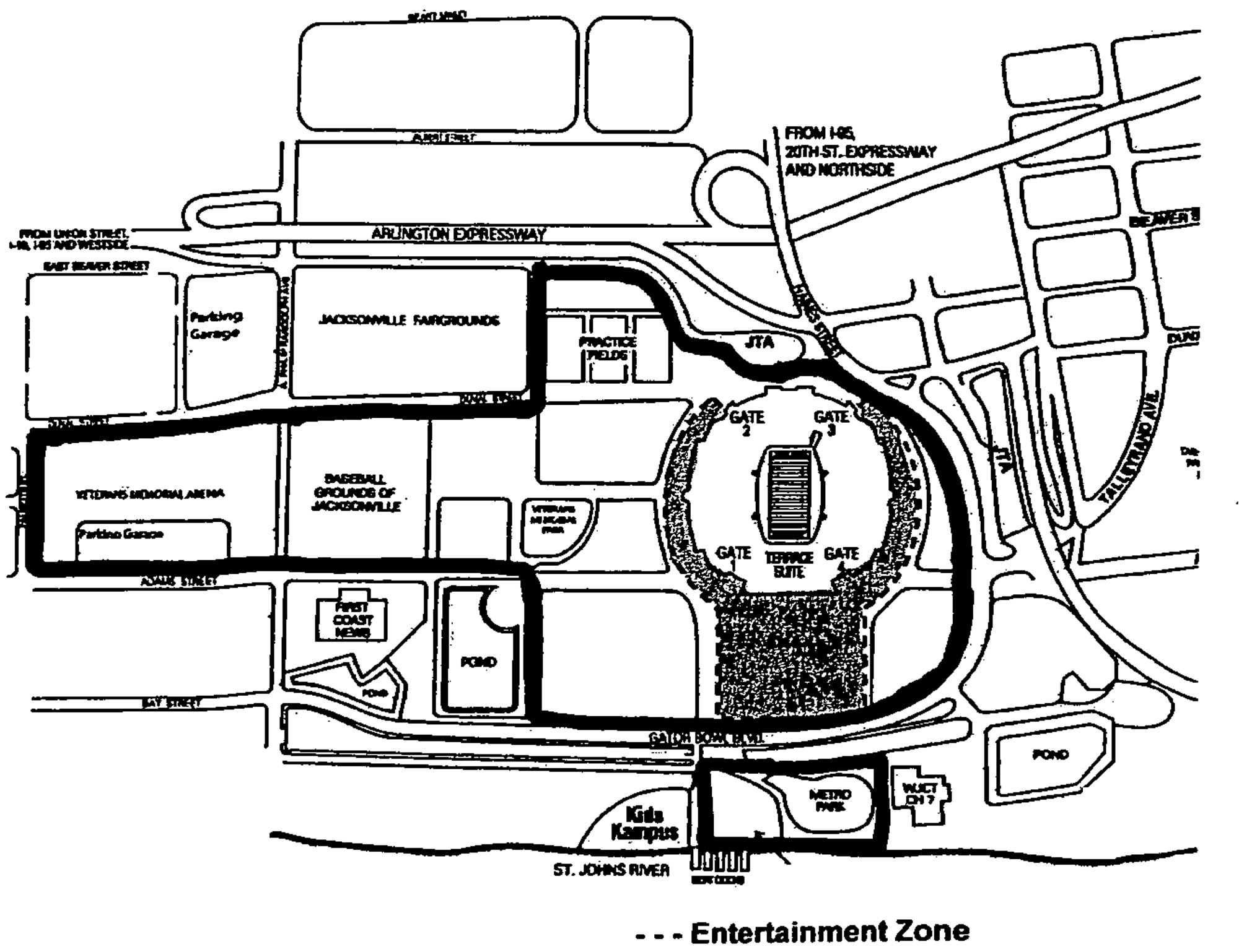 Signs located within the Entertainment Zone, which for purposes of this Section shall mean signs erected on or within the Entertainment Zone, which shall be defined as the fenced area located between the north end of EverBank Field and Gator Bowl Boulevard, as shown in Figure 1.