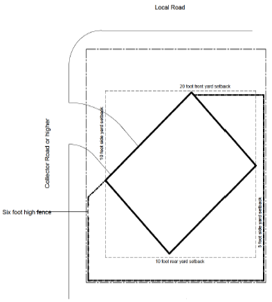 Site orientation of the structure: The dwelling shall be oriented on the lot so that its long axis is parallel with the street. A perpendicular or diagonal placement may be permitted if the dwelling complies with the perpendicular or diagonal placement projection requirements in Section 656.432(a)(2) above; provided, however, if the deficiency along the axis parallel to the street is less than ten percent, then landscaping may be used to cure the deficiency, as approved by the Zoning Administrator.