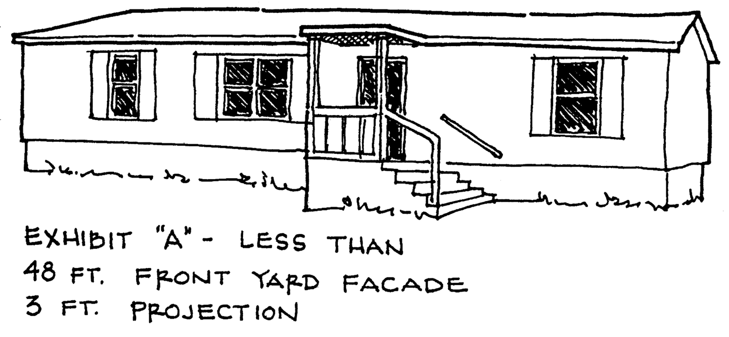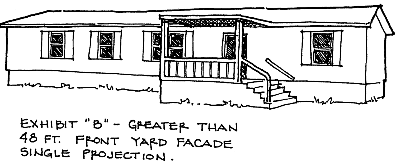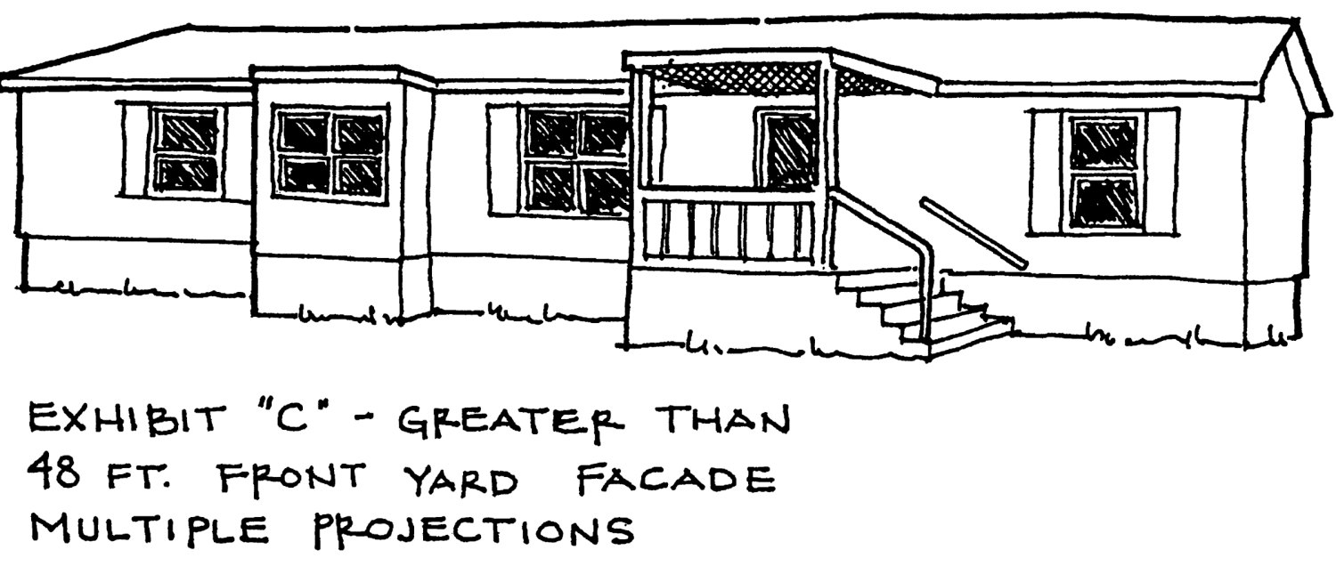 Minimum dimensions of exterior facade. The exterior facade of the dwelling's wall which faces the front yard, shall contain projections as described herein. Examples of projections which comply with the requirements of this subsection are visually depicted in Figures "A," "B," and "C." All projections shall be at least two feet and ten inches wide. Front yard facades less than 48 feet long shall contain at least one projection which is at least three feet long. Front yard facades 48 feet or longer shall contain a projection or projections totaling 20 percent of the total length of the facade, with no one projection being less than three feet long. For dwellings placed perpendicularly or diagonally on a lot pursuant to subsection (5) below, the projections shall be as follows: