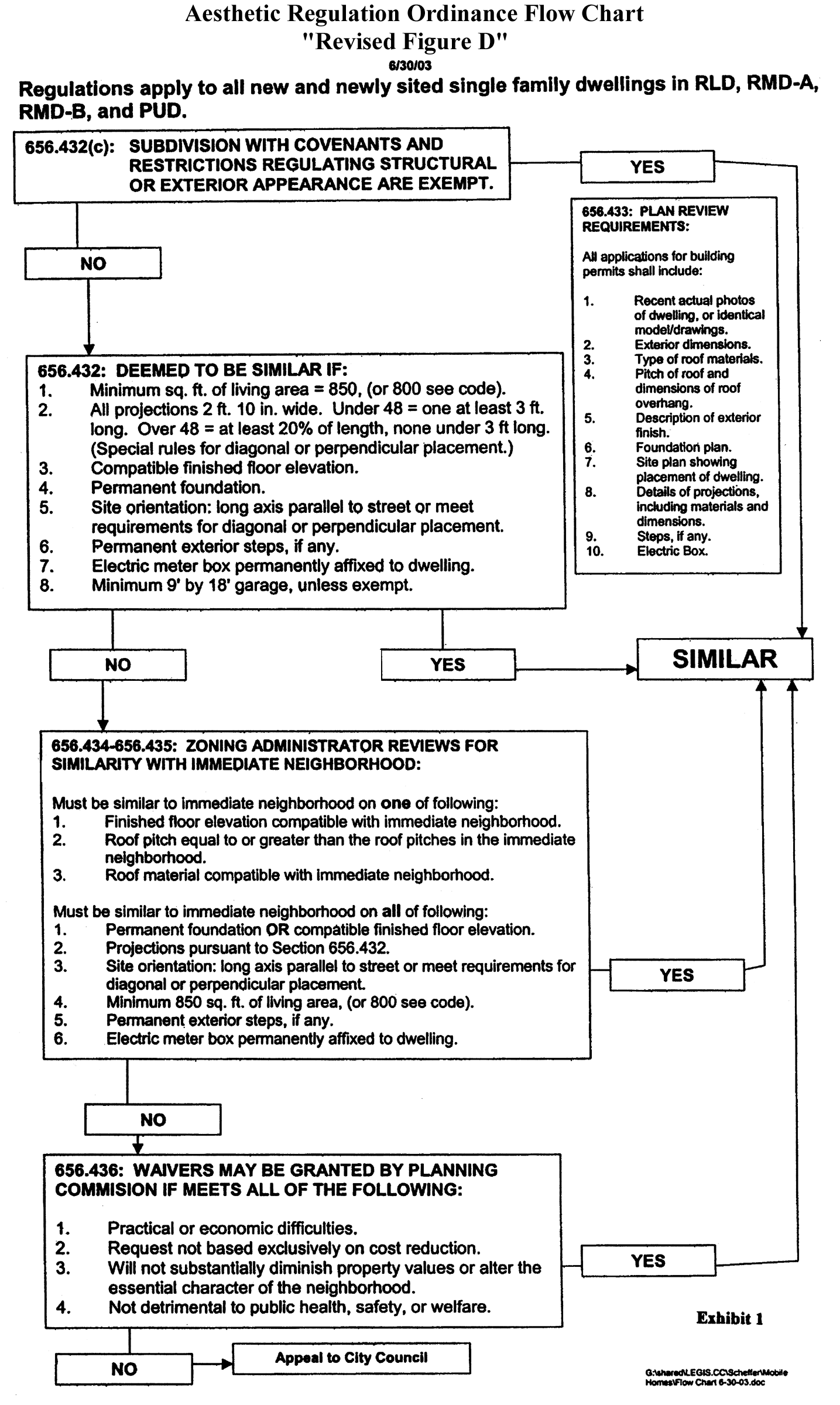 A single-family dwelling proposed to be located in a subdivision which is subject to covenants and restrictions which regulate structural or exterior appearance and aesthetics and which apply to all of the lots within the subdivision is deemed to be similar in appearance and is therefore exempt from the requirements of this Section 656.432. In order to qualify for this exemption, the applicant shall furnish recorded copies of both the plat and the applicable covenants and restrictions at the Zoning counter when the application for a building permit is filed. If the plat and the applicable covenants and restrictions for the subdivision are already on file with the Zoning counter, the applicant shall certify that these documents are on file and shall describe the proposed location of the dwelling within the subdivision in a form acceptable to the Zoning Administrator.
