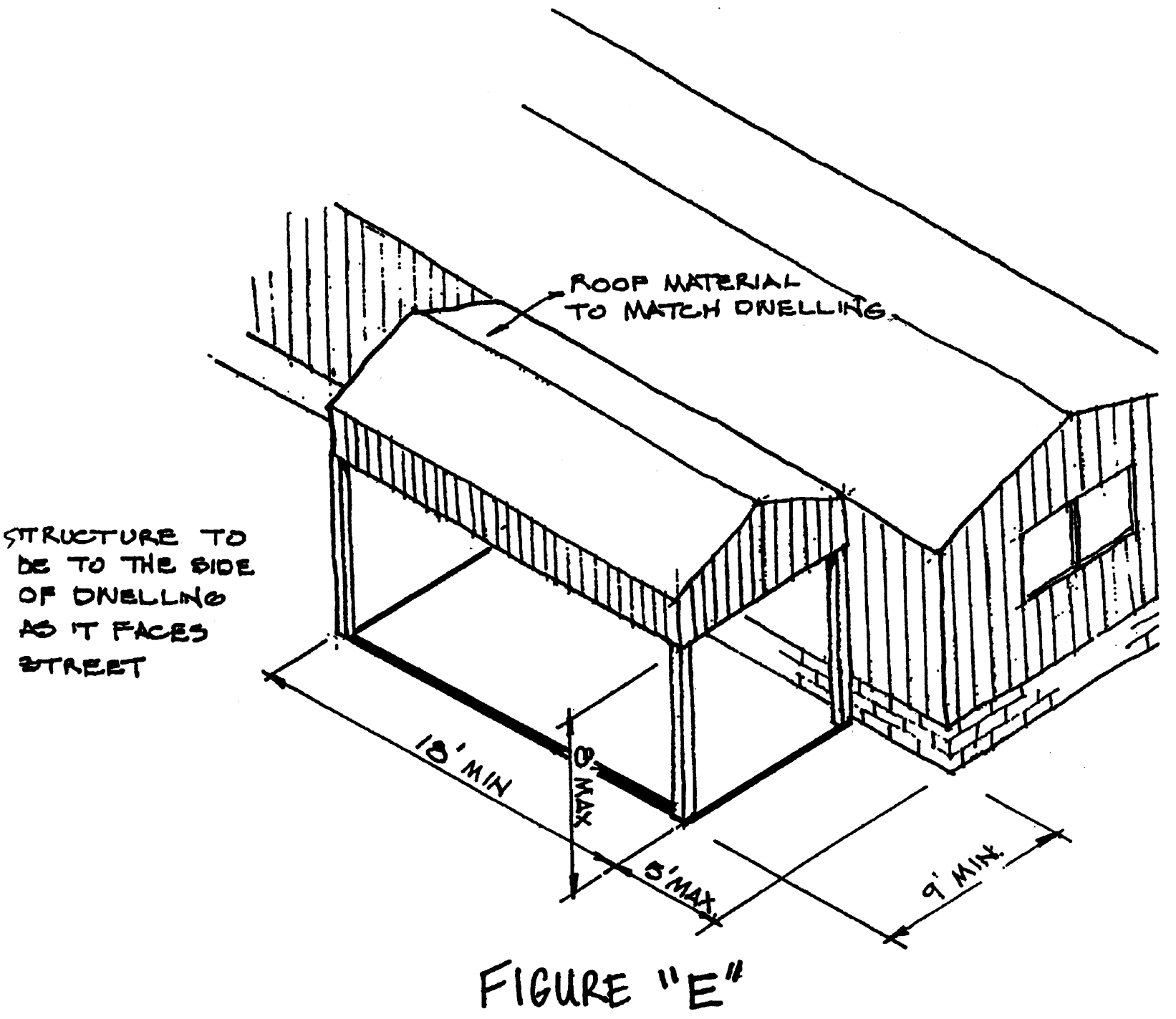 As visually depicted in Figure "E," the dwelling shall have a minimum nine feet by 18 feet covered structure located no more than 12 inches from the dwelling. The structure must have roof material consistent with the dwelling's roof material. The dwelling and the structure must have gables and/or hips and the roof pitch of the structure must be equal to or greater than the roof pitch of the dwelling. The structure may not be set back more than five feet from the exterior facade of the dwelling's wall which faces the front yard and the structure may not be located directly in front of the exterior facade of the dwelling's wall which faces the front yard. The structure shall have a continuous fascia extending downward from the soffit around the perimeter of the structure. The fascia shall extend downward at least 24 inches.