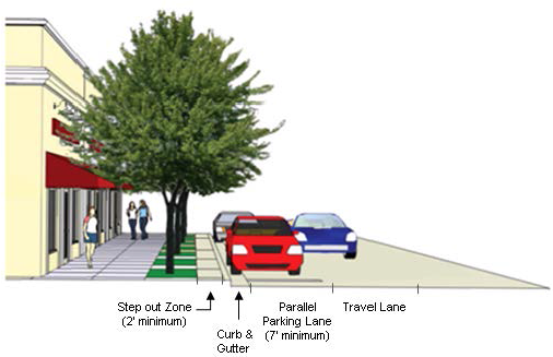 On-street parallel parking shall have a minimum two-foot step out zone along the adjacent curb, in addition to the minimum sidewalk width requirements provided in the Land Development Procedures Manual.