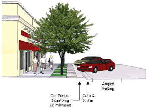 Back-in or head-in 60-degree angled parking shall contain a minimum two-foot overhang zone in addition to the minimum sidewalk width requirements provided in the Land Development Procedures Manual.
