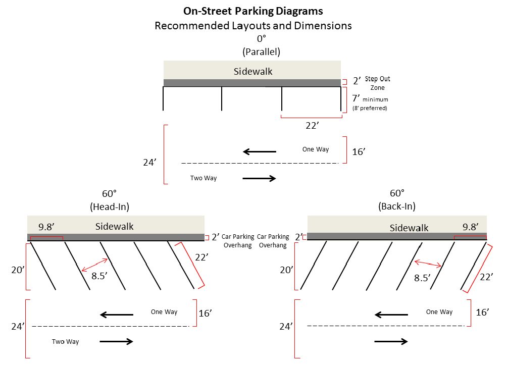 See Table 1 below for On-Street Parking Dimensions and see Figures C, D and E below for dimension diagrams.