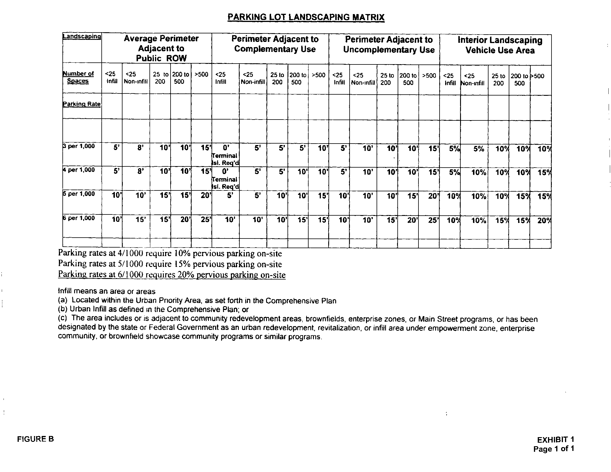 Landscaping. Off-street parking and loading areas shall be landscaped in accordance with the requirements of Part 12 (Landscape and Tree Protection Regulations) and those uses described in Sections 656.604(e)(1) and 656.604(f)(1) shall meet or exceed the landscaping requirements contained within the Parking Lot Landscaping Matrix, Figure B attached.