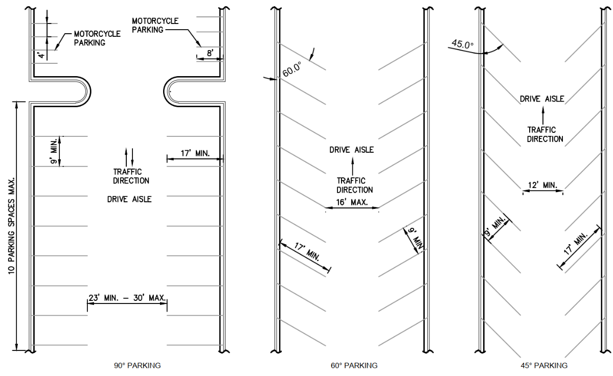 Motorcycle spaces: Four (4) feet by eight (8) feet.