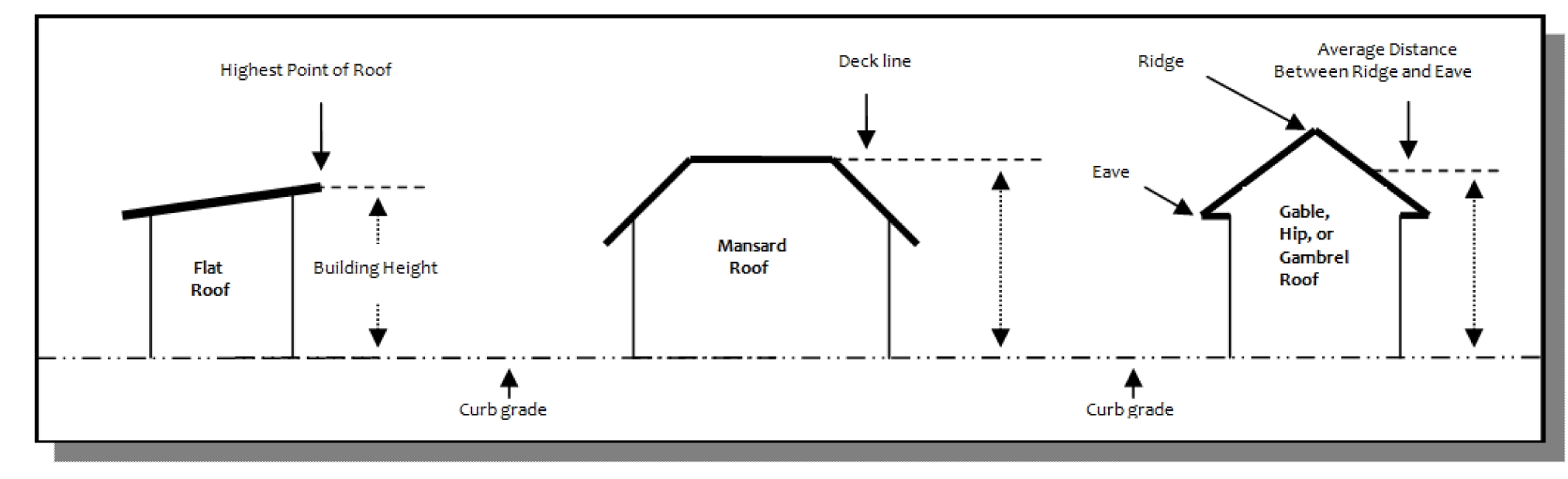 Building, height of. The vertical distance measured from the level of the curb or the established curb grade opposite the middle of the front of the structure to the highest point of the roof if a flat roof, to the deck line of a mansard roof, or to the mean height level between the eaves and ridge of a gable, hip or gambrel roof. For buildings set back from the street line, the height shall be measured from the average elevation of the ground surface along the front of the building.