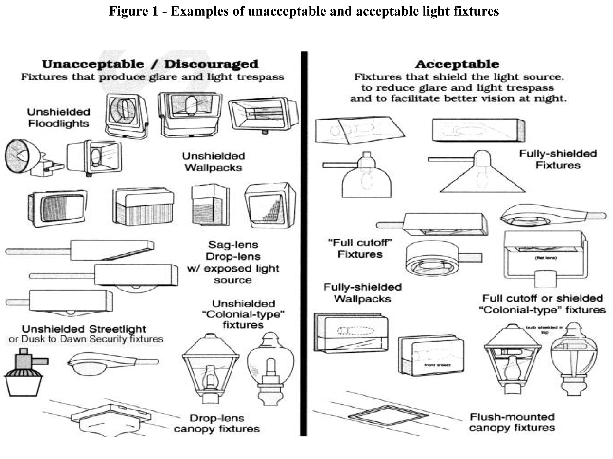 Lighting of predominantly horizontal surfaces. For the lighting of predominantly horizontal surfaces, light fixtures shall be full-cutoff fixtures that meet Illuminating Engineering Society of North America (IESNA) criteria, and shall be aimed straight down (see figure 1). Examples of predominantly horizontal surfaces include, but are not limited to, parking areas, roadways, vehicular and pedestrian passage areas, merchandising and storage areas, under-canopy lighting (automotive-fuel dispensing facilities, drive-thrus, etc.), automotive sales areas, loading docks, active and passive recreational areas, building entrances, sidewalks, bicycle and pedestrian paths, and site entrances.