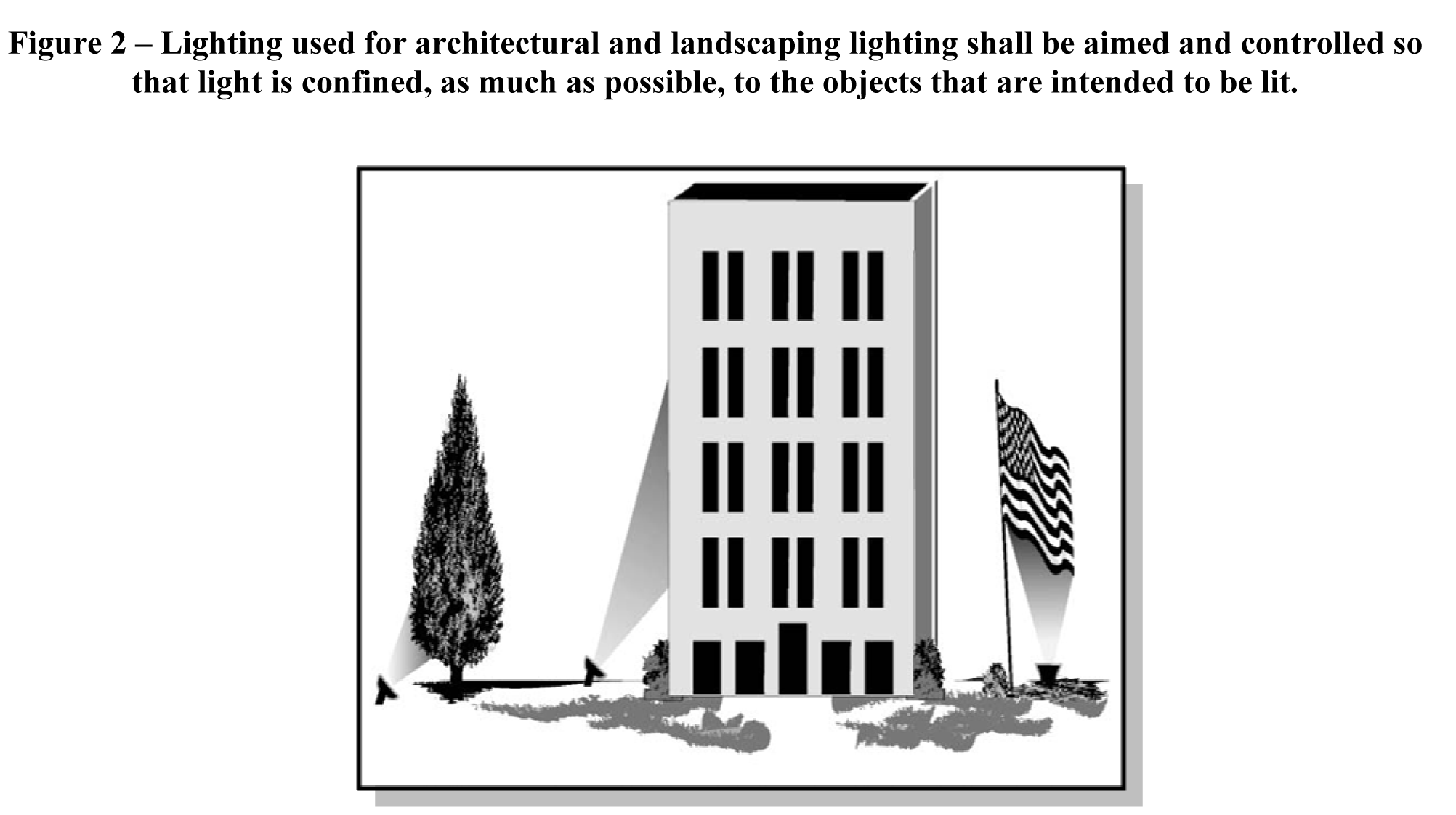 Lighting of predominantly non-horizontal surfaces. For the lighting of predominantly non-horizontal surfaces, light fixtures shall be full-cutoff or directionally shielded and shall be aimed and controlled so that light is confined, as much as possible, to the objects that are intended to be lit and does not project into the windows of neighboring residences, adjacent uses, past the object being illuminated, skyward, or onto a public roadway (see figure 2). Examples of predominantly non-horizontal surfaces include, but are not limited to, buildings, facades, landscaping, signs, displays, flags, and statuary, when their uses are specifically permitted by the county. All outdoor lighting associated with illuminating signage shall be required to follow specifications for sign lighting found in article 2, division 3.