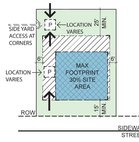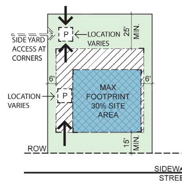 2. The front build-to line will range from 10' to 25' behind street ROW. Special site conditions such as topography or lot widths permit a larger setback. However, in more urban conditions, dwellings may be set up to the property line at the sidewalk. 3. There shall be at least 12' of separation between units that are not attached. In the case where a corner unit is on a street corner the side build-to-line shall be 8'—15'. Special site conditions such as topography or lot widths permit a larger yard. |