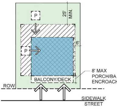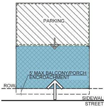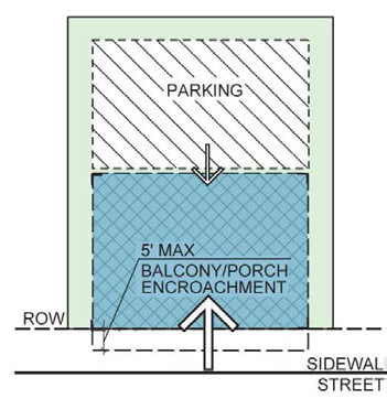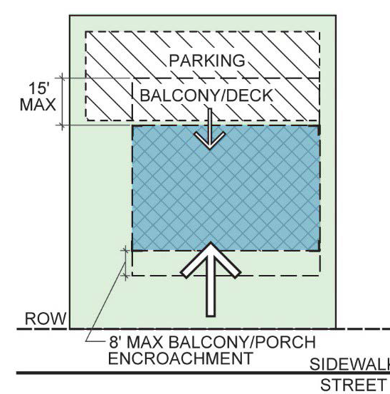 2. For buildings set back from sidewalk, balconies, stoops, stairs, unenclosed porches and bay windows are permitted to encroach into the front setback area up to 8'. |