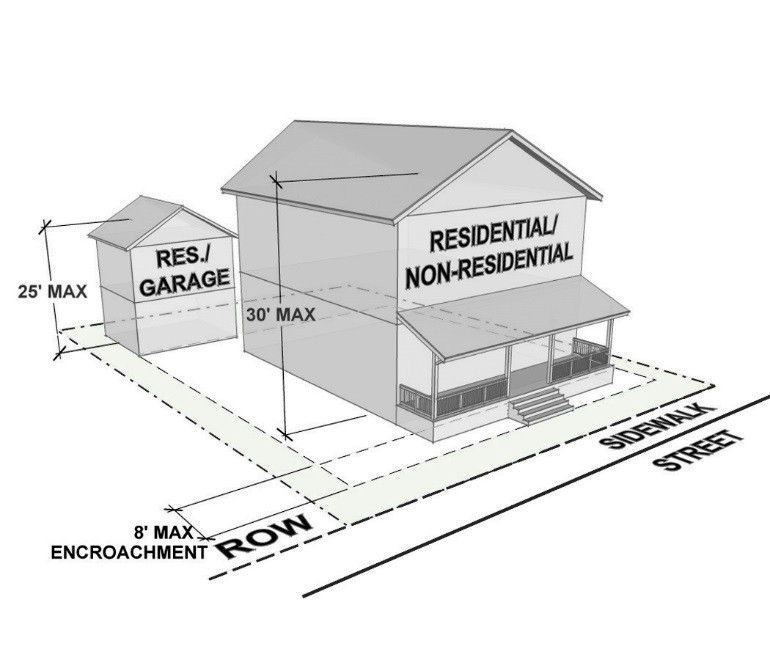 2. Building height to the ridge may vary depending on the roof pitch. 3. Permitted uses are indicated on the graphic above and are further controlled by zoning district standards. | |