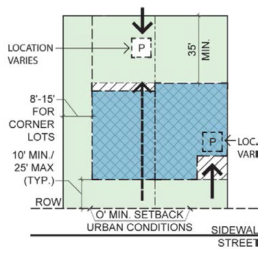 | 1. Buildings shall be placed on the lot within the zone represented by the hatched area. In most cases, the build-to line will range from 0' to 15' behind the street ROW. Within the limits described above, front setbacks will vary depending upon site conditions. Special site conditions such as topography, pattern of lot widths, or setbacks of existing buildings on the same block permit a larger setback. Setbacks should be used in a manner that encourages pedestrian activity. For example, squares or spatially defined plazas within building setback areas can act as focal points for pedestrians. |