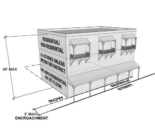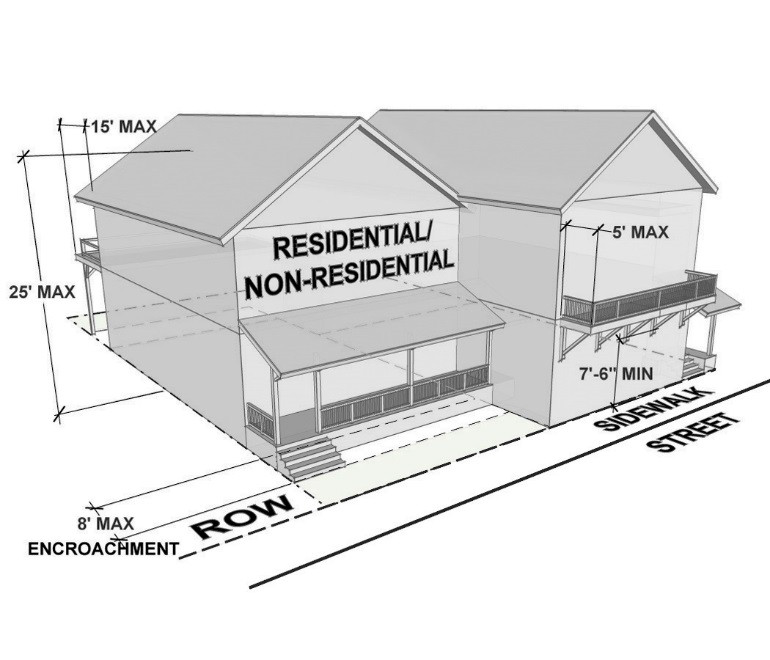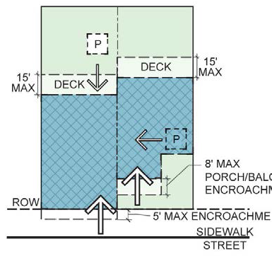 2. Attached decks are permitted to encroach into the rear setback up to 15 feet. 3. For buildings set up to the sidewalk, Balconies and bay windows at an upper level and their supports at ground level are permitted within the sidewalk as shown by the shaded area. Encroachments affixed to the building and horizontally protruding more than 6" from the face of the building must have a minimum 7'6" clearance from the finished grade. |