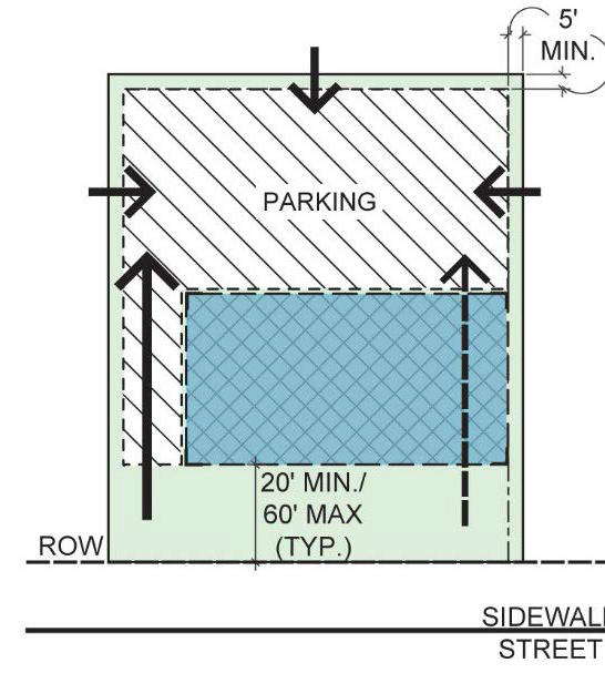 2. Side and rear setbacks will vary according to side and rear buffer requirements as set forth in Article 11, with a minimum 0-foot setback when no buffer is required. 3. Front and rear building façades shall be generally parallel to frontage property lines. The façade shall be determined by the massing of the building. Buildings in all locations should relate the principal façade to the sidewalk and public space of the street. 4. Parking shall be located primarily to the rear of the building; sideyard parking shall occupy no more than 35% of the primary frontage line and shall not be placed in any sideyard abutting an intersecting street. Where dimensions of existing lots restrict parking behind buildings, the limitations on sideyard parking may be modified. 5. Points of permitted access to the parking indicated by arrows. | |