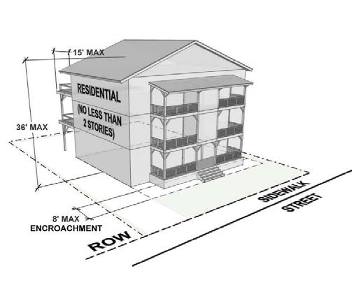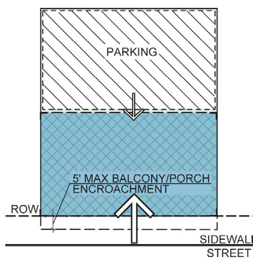 2. For buildings set back from the sidewalk, balconies, stoops stairs, open porches, bay windows, and awnings are permitted to encroach into front setback area up to 8'. |