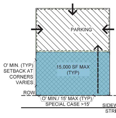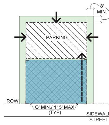 area. In most cases, the build-to line will range from 0' to 115' behind street ROW.