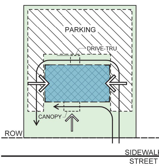 2. Drive-throughs, gasoline and fuel pumps, and auto-oriented service facilities shall be located to the rear of the building. 3. Entrance canopies (for motels, etc.) shall be oriented towards the primary street. 4. Typical vehicular circulation movement is indicated by thin line arrows. |