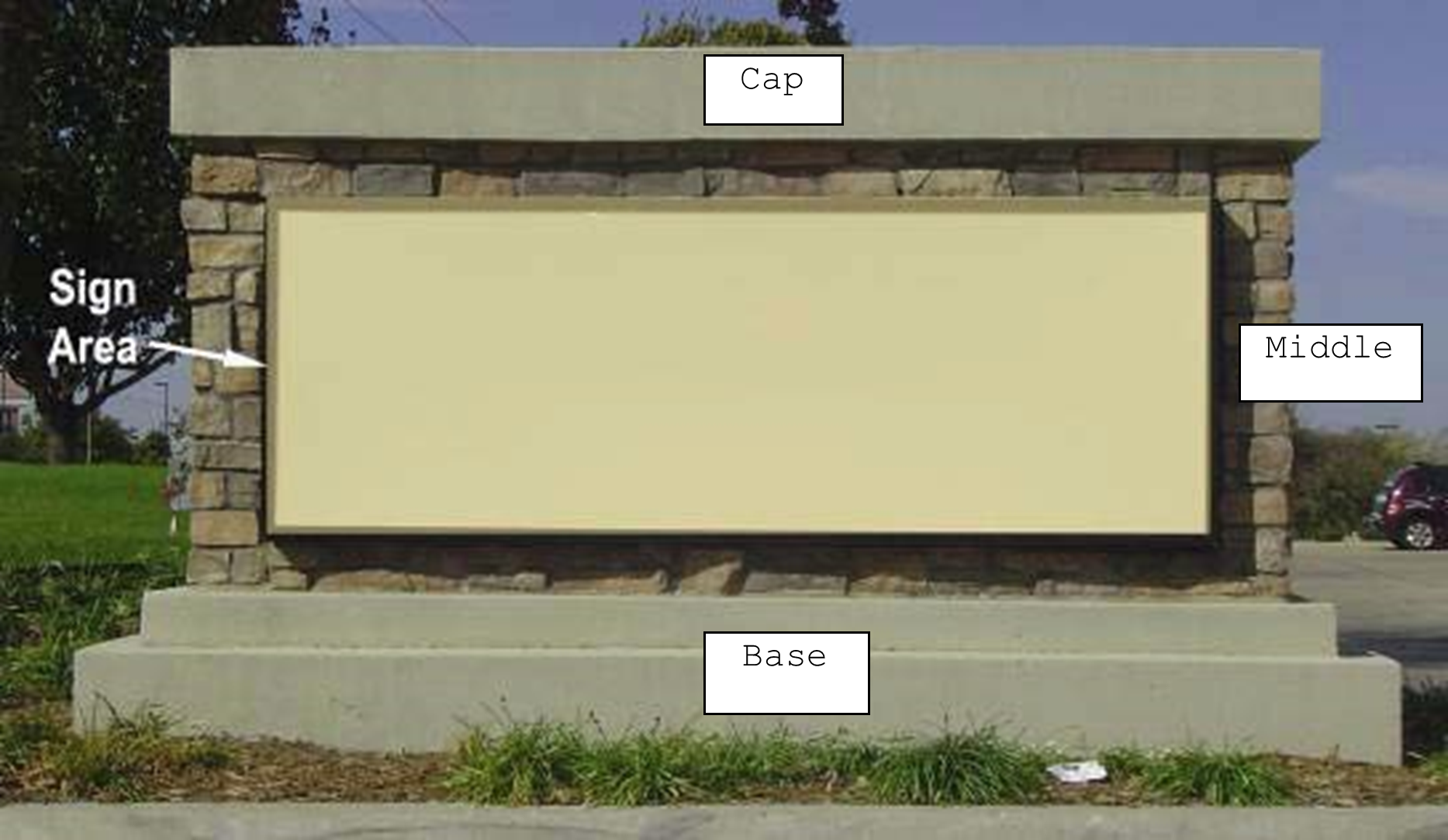 General design requirements and sign area measurement for monument signs. As in traditional building design, monument signs shall be designed to include a base, middle, and cap. The following illustration shows a monument sign having these architectural characteristics, as well as how sign area is to be measured on a monument sign.