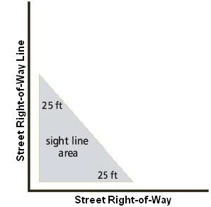 Sight Triangle Required. Unless provided otherwise, a clear view at each corner of an intersection shall be maintained by establishing an unobstructed "sight triangle." The extent of the required sight triangle varies according to the speed limit of streets forming the intersection. For streets signed 35 MPH or greater, the area to be clear of view obstructions at unsignalized intersections is the triangular area formed by the point of intersection of street right-of-way lines and a point located along each right-of-way line at a distance of 35 feet from the point of intersection. For intersecting streets signed for less than 35 MPH, the area to be clear of view obstructions at unsignalized intersections is the triangular area formed by the point of intersection of street right-of-way lines and a point located along each right-of-way line at a distance of 25 feet from the point of intersection.