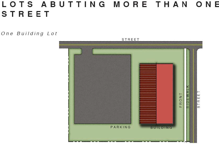 Lots Abutting More Than One Street. On lots that abut more than one street, building and lot shall generally front upon the more pedestrian-oriented street, given the arrangement of existing and proposed streets and drives, and the orientation of buildings on adjoining lots.