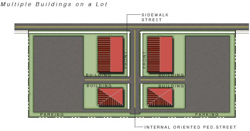 Multiple Buildings on a Lot. Where multiple buildings are permitted on a single platted lot, each building shall generally front upon a pedestrian-oriented street, external or internal to the development; side and rear yard designations shall be determined on the basis of building orientation.