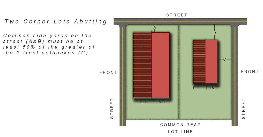 Two Corner Lots Abutting at Rear. If two corner lots are separated by a common rear lot line, the common side yards of the lots on the street must be at least 50 percent of the greater of the two front setbacks, existing or required.