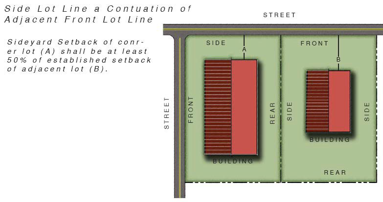 Side Lot Line a Continuation of Adjacent Lot Front Lot Line. In any district, where the side lot line of a corner lot is substantially a continuation of the front lot line of the lot to its rear, the required side yard of the corner lot shall (a) be at least 50 percent of the established front setback of the adjacent lot or (b) establish a transition between existing buildings by stepping toward the street or back from the street a distance equal to the lesser building setback + one-half of the difference between the setbacks of the adjoining buildings.