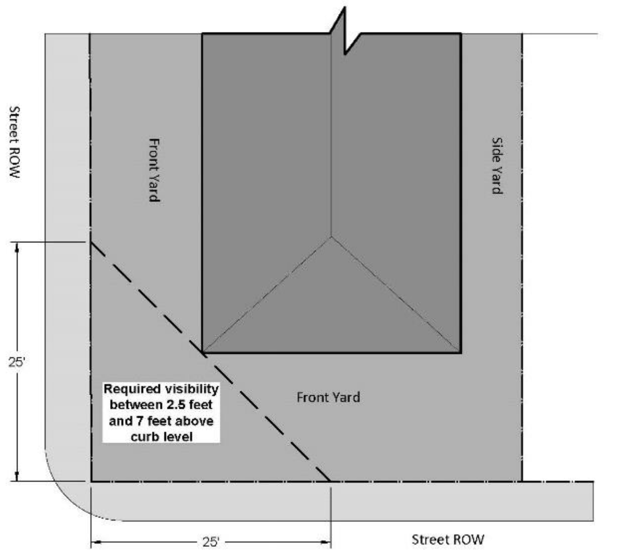At street intersections in all districts, no building or structure shall be erected and no vegetation shall be maintained between a height of two and one-half feet and seven feet above street level of the triangle formed by the two pavement edge lines and a third line joining points on the pavement edge line of 25 feet from the intersection.