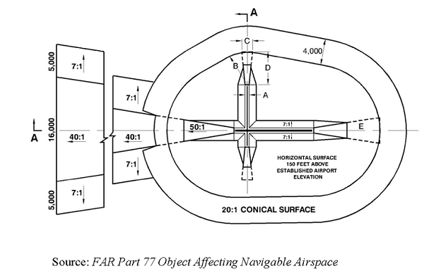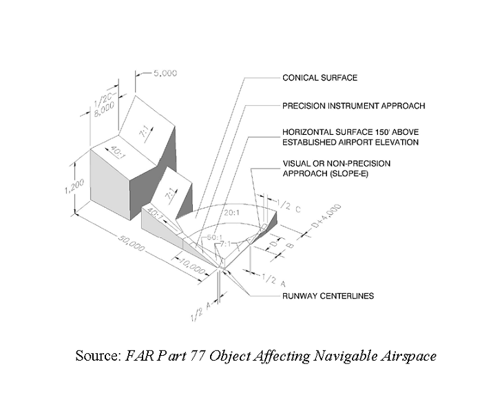 Conical surface—Extends upward and outward from the periphery of the horizontal surface at a slope of 20 feet horizontally for every one foot vertically (20:1) for a horizontal distance of 4,000 feet.