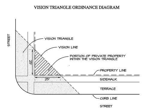 A vision triangle is all that land at a street intersection between the vision line and the street intersection. The vision line is determined by drawing a straight line from the curb or edge of pavement of one street to the curb or edge of pavement of the intersecting street, and such line shall run through two points, each such point being on the edge of the street right-of-way/property line and 25 feet back from the corner formed by the intersection of the two street right-of-way/property lines, as shown on the vision triangle ordinance diagram in Subsection (c) of this section. No bushes or shrubbery nor any opaque or semi-opaque object is permitted in the vision triangle if such bush, shrub or object is over 30 inches above curb grade, except trees trimmed to the trunk and at least to seven feet above sidewalk grade. Official traffic signs and signals and utility poles are exempt from this restriction.