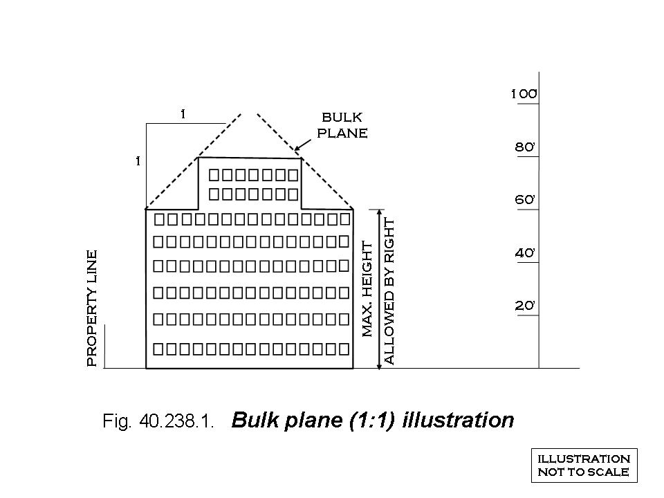 Bulk plane. A building exceeding the maximum height allowed by right in this district shall use bulk planes on the front, side, and rear façades. The bulk planes shall begin at a horizontal line located directly above the line(s) created by the setback, at a height equal to the maximum height permitted by right, rising over the lot upward at a forty-five-degree angle equal to a pitch or slope of (1) foot of vertical distance for each (1) foot of horizontal distance. See Figure 40.238.1, Bulk plane (1:1). No structure or portion of any structure shall be permitted to protrude through any bulk plane. Residential buildings permitted to exceed the maximum height allowed by right in this district shall not be required to meet the area regulations of section 40-239(b)(2)(b).