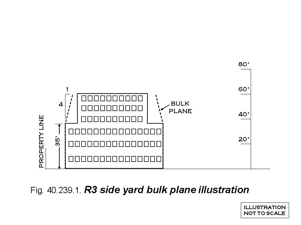 Buildings exceeding thirty-five (35) feet in height, that are less than or equal to the maximum height allowed by right in this district, shall use bulk planes beginning at horizontal lines located directly above all lines created by front, side, and rear setbacks at a height of thirty-five (35) feet, rising upward over the lot at a pitch of four (4) feet additional vertical distance for every one (1) foot additional horizontal distance. See Figure 40.239.1.