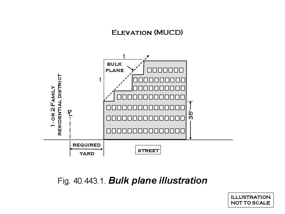 To encourage compatibility with surrounding land uses, buildings shall use bulk plane(s) only on façade(s) facing an abutting single-family or two-family residential zoning district. To match the maximum thirty-five (35) foot maximum height allowed by right in single-family and two-family residential zoning districts the bulk plane(s) shall begin at a horizontal line located directly above the line(s) created by the setbacks at a height of thirty-five (35) feet, rising over the lot upward at a 45-degree angle equal to a pitch or slope of one (1) foot of vertical distance for each one (1) foot of horizontal distance. See Figure 40-443.1.