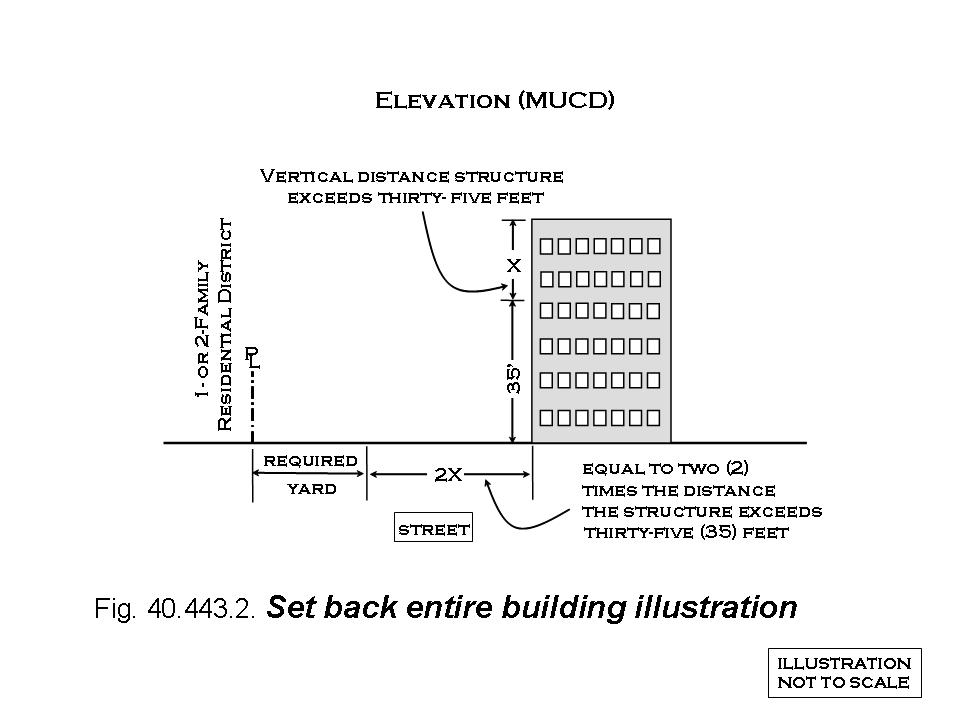 To encourage compatibility with surrounding land uses, buildings on lots that abut single-family or two-family residential zoning districts and do not meet the requirements of section 40-443(b)(1) listed above shall increase only the yard(s) abutting any single-family or two-family residential zoning district. In addition to the minimum yard requirement of this district, the abutting yard shall be increased by locating the entire building a minimum horizontal distance measured from the lot line abutting the single-family or two-family residential zoning district to the base of the building and equal to two (2) times the vertical distance the building exceeds thirty-five feet in height. See Figure 40-443.2.