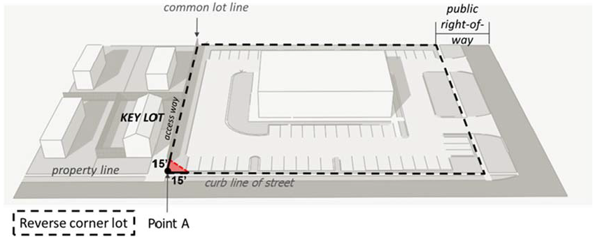 Reverse corner lots. On the area of a development site that abuts the front yard of a key lot and a street, a reverse corner lot sight triangle shall be provided. The sight triangle shall measure fifteen (15) feet, be aligned to the common lot line of the reverse corner lot and key lot and the edge of the applicant's property line parallel to the street, and shall be established in accordance with the following: