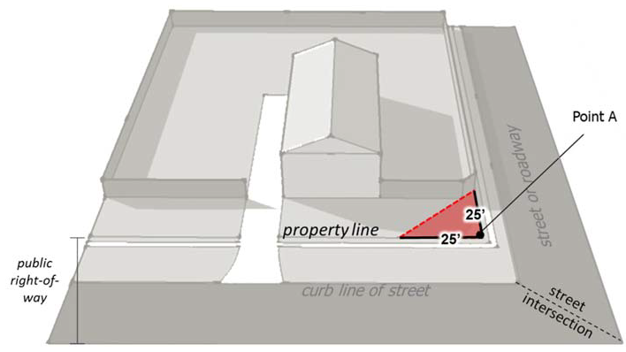 The triangle shall begin from the point where the curb lines of the intersecting streets meet, labeled "Point A" in Figure 40.665.5. If there is a radius, street curb lines shall be projected until they intersect; and