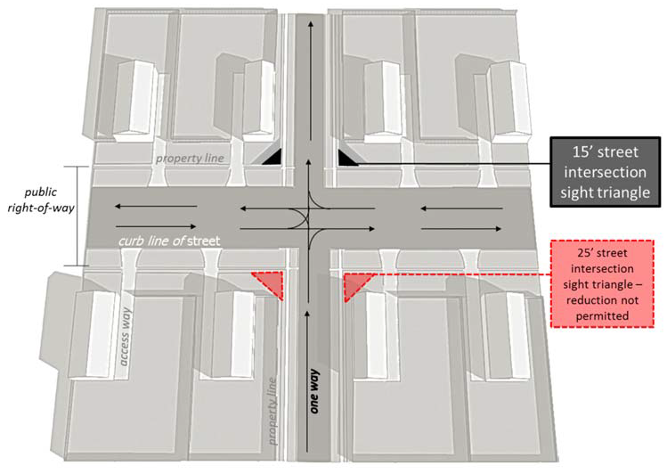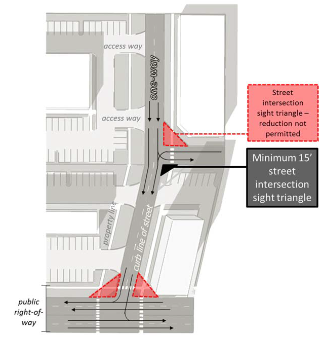 Access way sight triangle. The sight triangle shall measure fifteen (15) feet, be aligned to the edge of the access way pavement and the curb line of the street, and be established in accordance with the following: