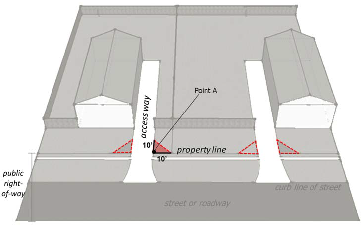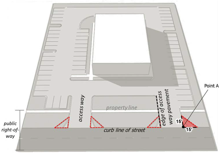 Each triangle shall begin from the point where the edge of the access way pavement is projected to intersect the curb line of the street, labeled "Point A" in Figure 40.665.7.