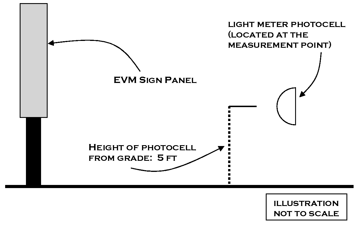 The light meter's photocell shall be set up at the measurement point at a height of five (5) feet above grade. The photocell shall be oriented to face the EVM sign panel. See Figure 40.682.2, Photocell orientation (elevation view).